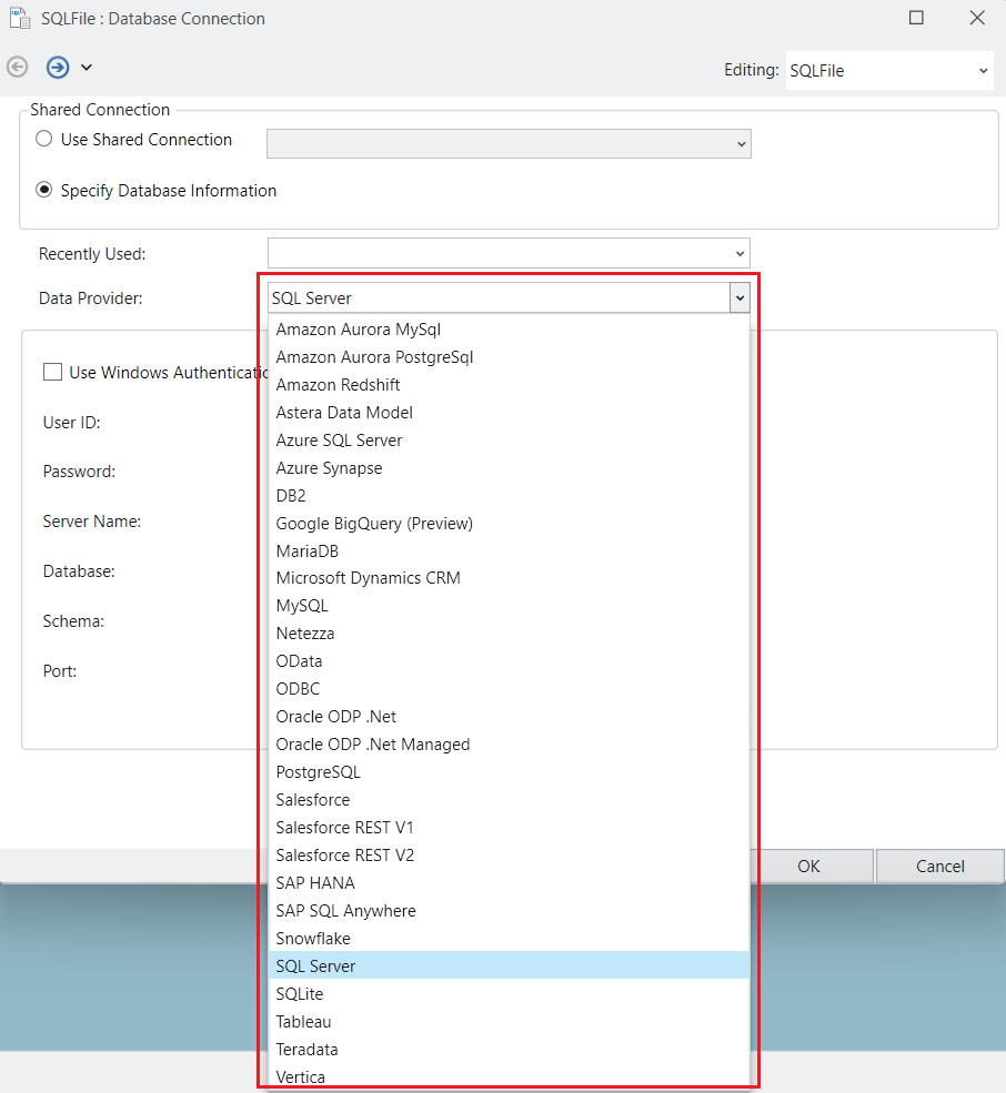 Astera offers native connectivity to several databases and applications. To connect to a database, click on the drop-down menu next to the Data Provider field and select a data provider from the list.