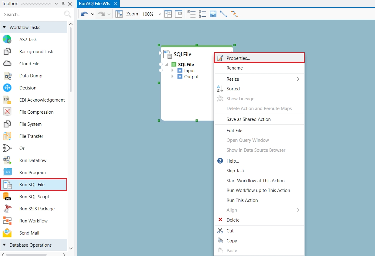 To use a Run SQL File task, drag-and-drop the Run SQL File task object onto the workflow designer. Configure the object by right-clicking on the object’s header and selecting Properties from the context menu.